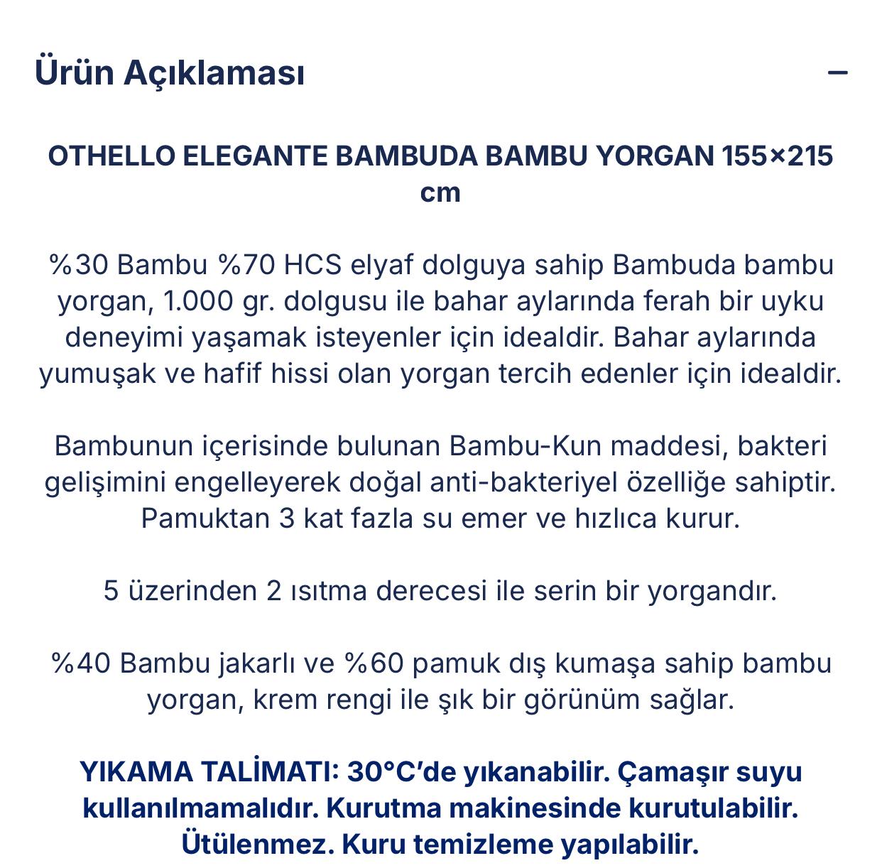 Othello Bambuda Elegant Yorgan, tüm bu özellikleri ile uyku kalitenizi arttıracak mükemmel bir tercihtir. Hayal gibi bir uyku için, şimdi Othello’nun sunduğu bu yüksek kaliteli yorgan ile tanışmanın tam zamanı! Sağlıklı, rahat ve şık bir uyku deneyimi için hemen sipariş verin.